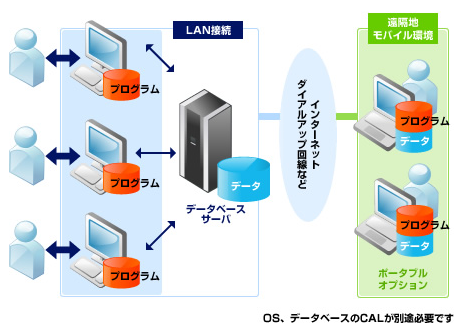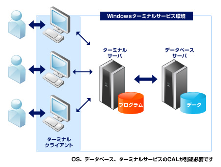 Windowsターミナルサービス環境(※)でデータベースの共有を行います。データだけでなく、プログラム自体も一元管理したいとういう大規模お客様向け。