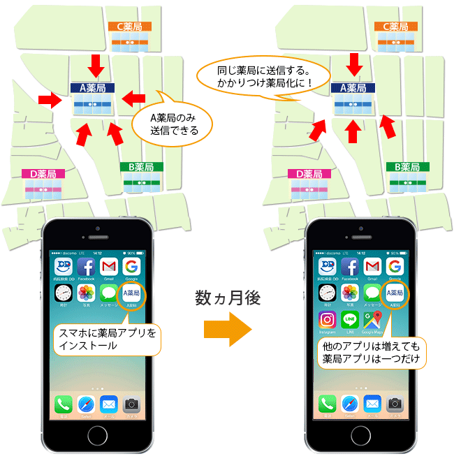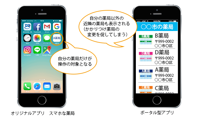 ポータル型の他社アプリだと、患者さんは薬局を色々選べるためかかりつけ薬局になりません。スマホな薬局なら、薬局オリジナルのアプリなので、一度アプリをインストールしてもらえば、ずっと同じ薬局を利用することになり、かかりつけ薬局促進になります!