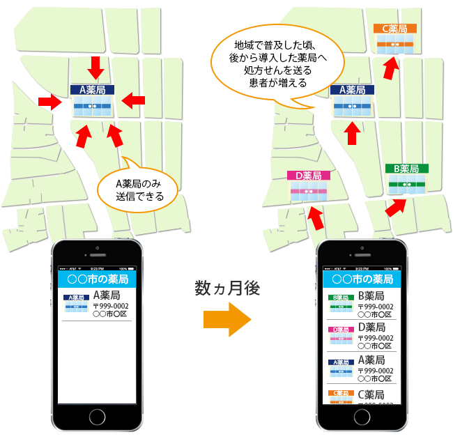 始めの頃は、地域で導入している薬局が少ないため処方せんが届きますが、数ヵ月後には導入薬局が増え、後から導入した薬局へ処方せんを送る患者が増えて、かかりつけ薬局になりません。
