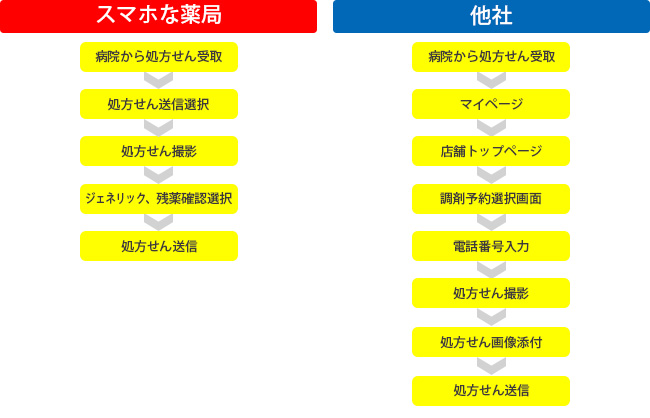 他社は7ステップ、スマホな薬局は、わずか4ステップ。患者さん側の操作が簡単なため、利用率が高くなります。